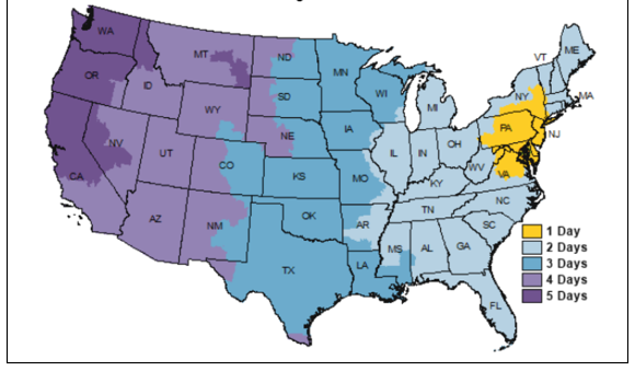 Find your shipping location on the map. Then look at the colored boxes on the right of the map. Those represent the approximate number of business days (weekends are not considered business days) it will take for you to receive your order. We can’t guarantee this timeframe but it is normally correct. We ship from Philadelphia, Pennsylvania.